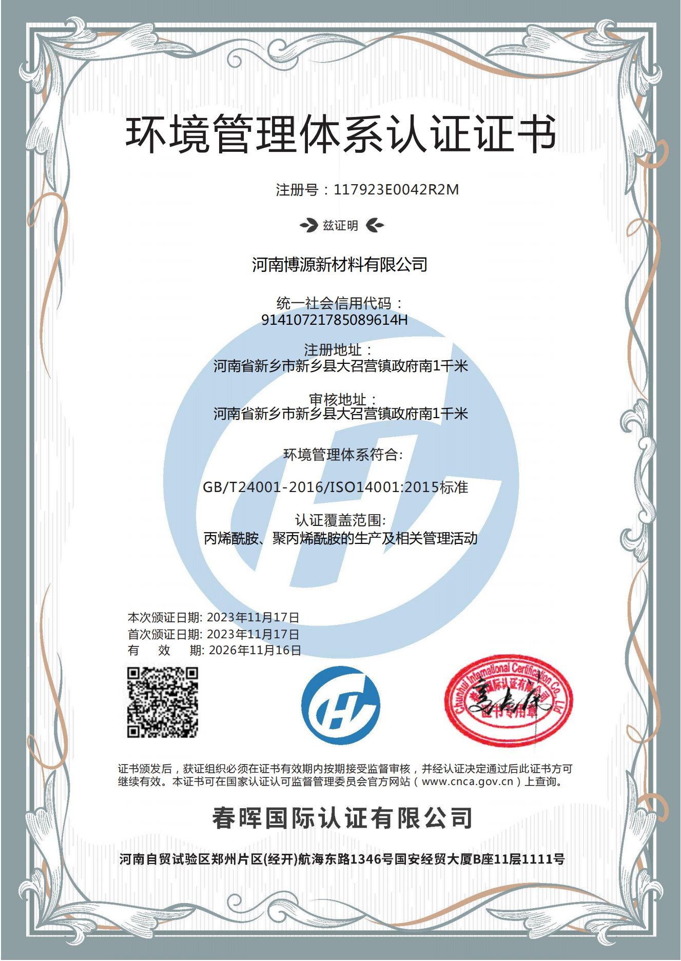环境管理体系认证证书